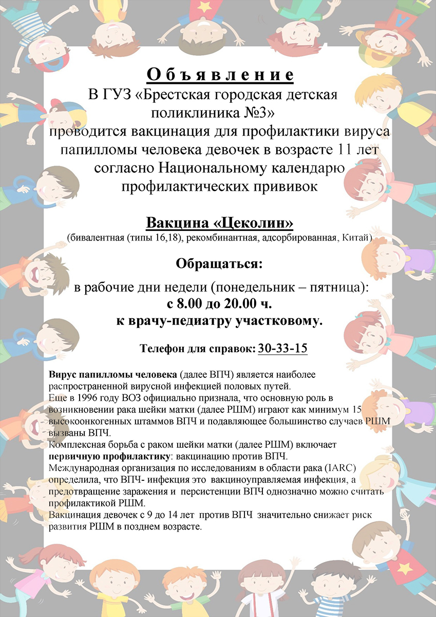 Приглашаем девочек 2015 года рождения на вакцинацию против вируса папилломы человека вакциной «Цеколин» (производитель Китай).