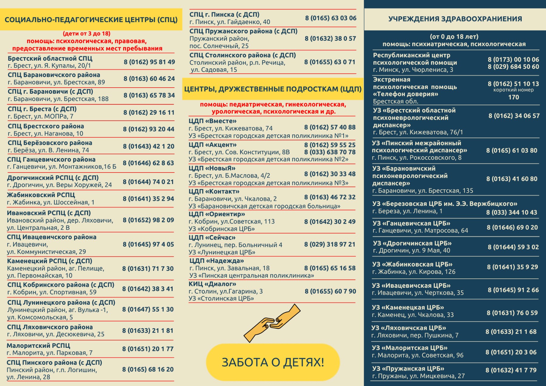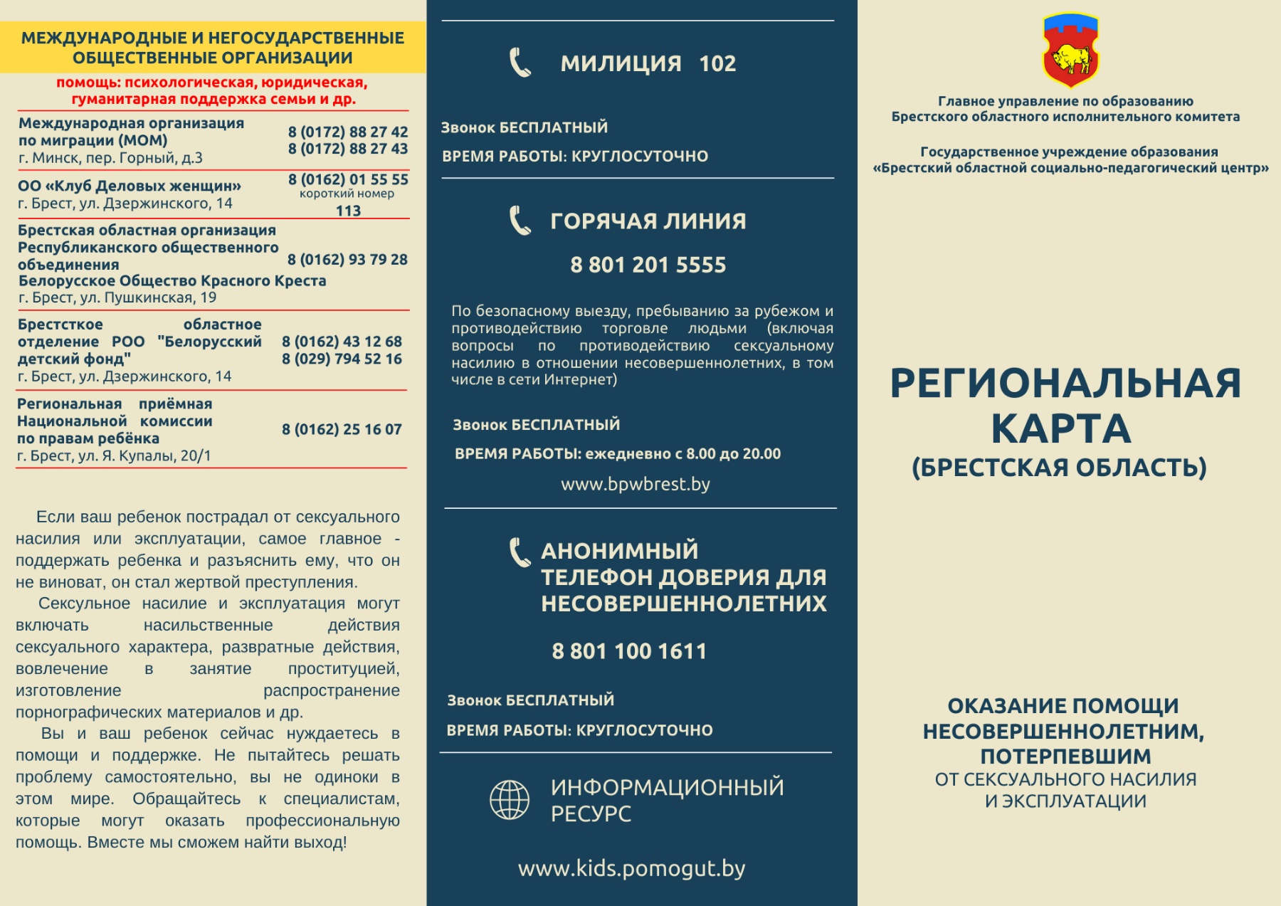 Если Вы располагаете информацией о фактах насильственных действий сексуального характера в отношении несовершеннолетних, вы можете на конфиденциальной и (или) анонимной основе сообщить указанные сведения в отделение по наркоконтролю и противодействию торговле людьми криминальной милиции УВД администрации Московского района г.Бреста по телефону 40 89 69 либо по телефону 102.